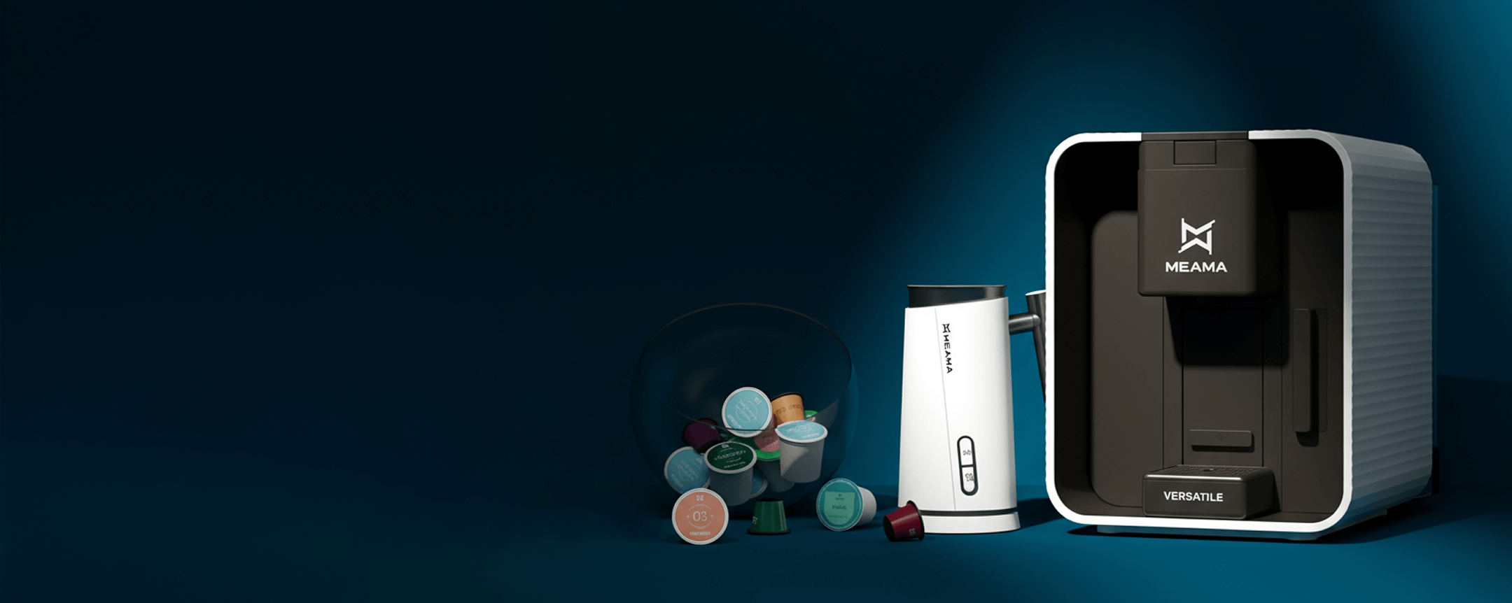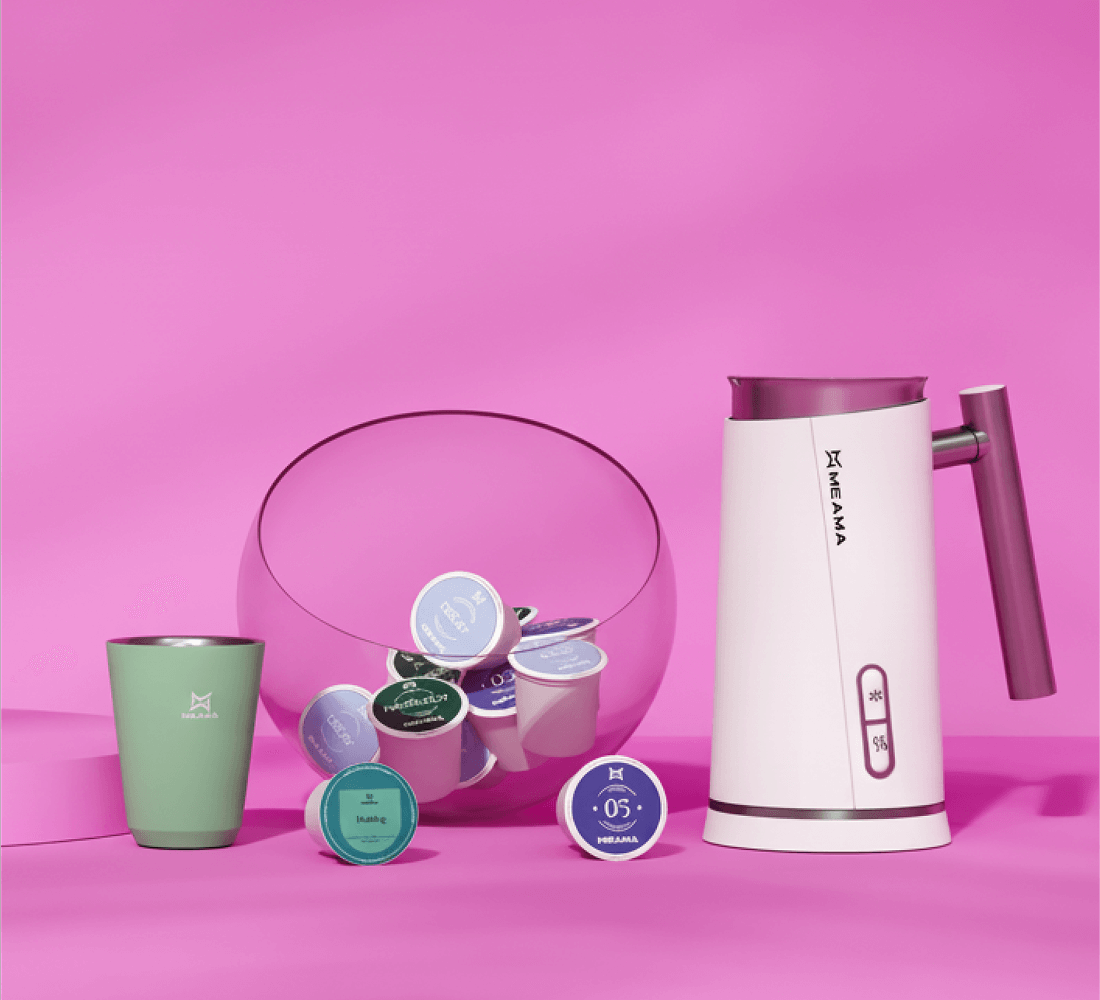 Unsere preisgekrönten Maschinen vereinen Design, Einfachheit und Flexibilität – darunter die Meama Versatile, kompatibel mit Espresso- und Multi-Kapseln.